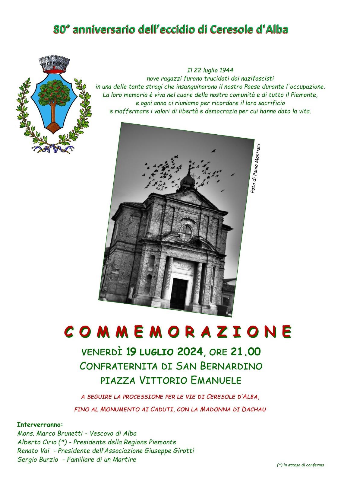 Venerdì 19 luglio 2024, alle ore 21,00 in Piazza Vittorio Emanuele, davanti alla Confraternita di San Bernardino, si terrà la Commemorazione dei Martiri di Ceresole.