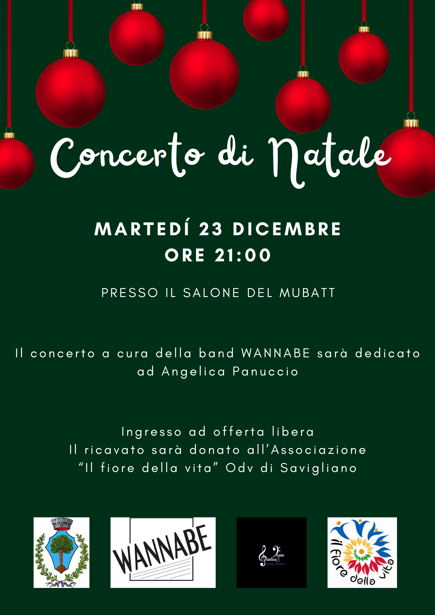 Martedì 23 dicembre alle ore 21:00 presso il salone del Mubatt si svolgerà il concerto di Natale organizzato dalla band "WANNABE". La serata sarà dedicata ad Angelica Panuccio, una ragazza braidese che ha collaborato con la band e che lo scorso maggio, alla tenera età di 14 anni, ci ha lasciati dopo una lunga battaglia contro la leucemia.