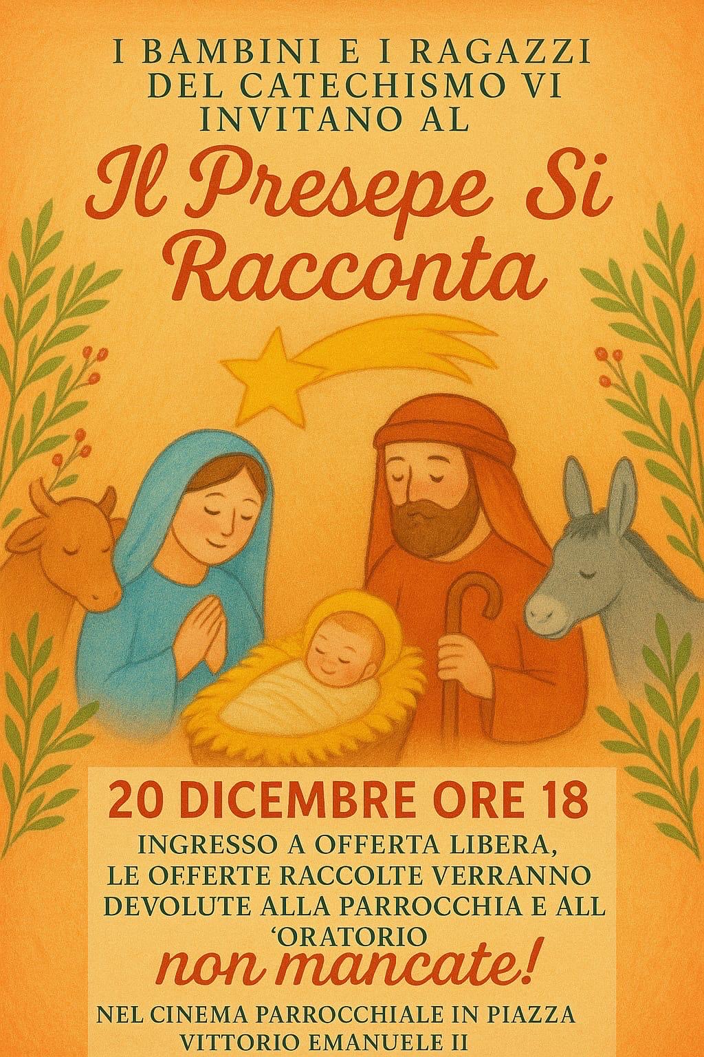 Sabato 20 dicembre alle ore 18:00 si svolgerà la recita di Natale dei ragazzi del catechismo dal titolo “Il Presepe Si Racconta” presso il cinema parrocchiale in Piazza Vittorio Emanuele II.