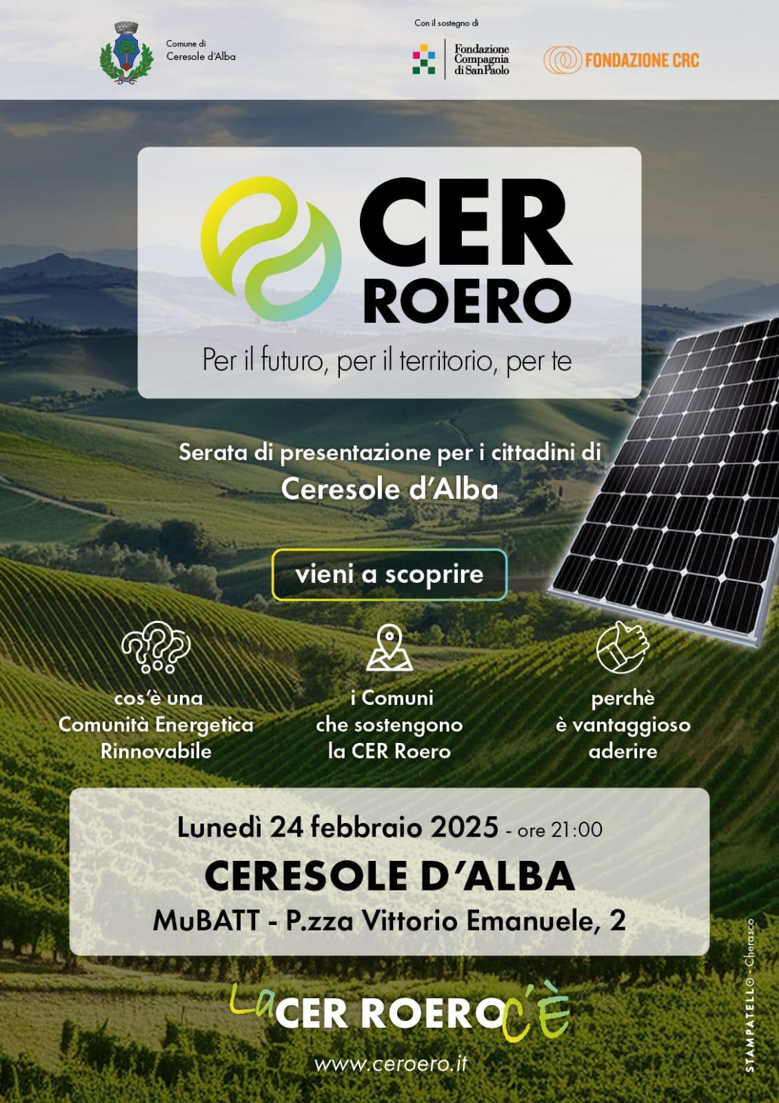 Si invitano i cittadini a partecipare alla serata di presentazione della nuova Comunità Energetica Rinnovabile, CER Roero, che si svolgerà lunedì 24 febbraio alle ore 21:00 presso il salone del MuBATT.