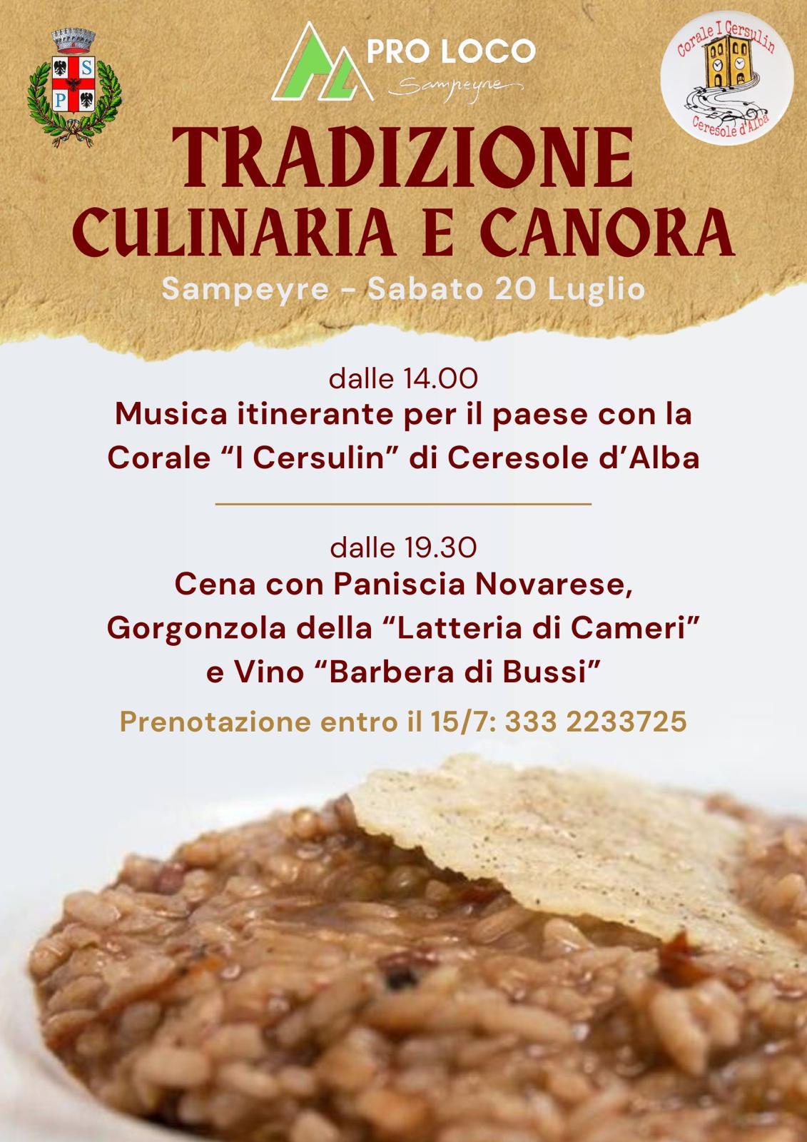 Sabato 20 luglio 2024 dalle ore 14:00 musica itinerante per il paese di Sampeyre con la corale "I Cersulin" di Ceresole d'Alba, a seguire la cena dalle ore 19:30.