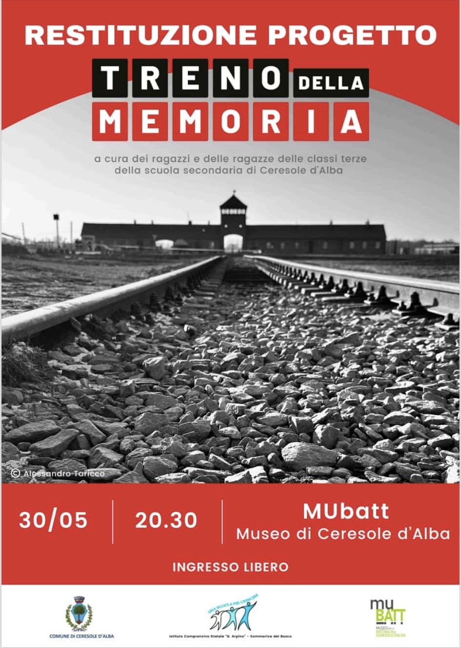 Venerdì 30 Maggio alle ore 20:30 presso il salone del Mubatt ci sarà un evento a cura dei ragazzi e ragazze delle classi terze della scuola secondaria di Ceresole d’Alba in restituzione al progetto “Treno della Memoria”.