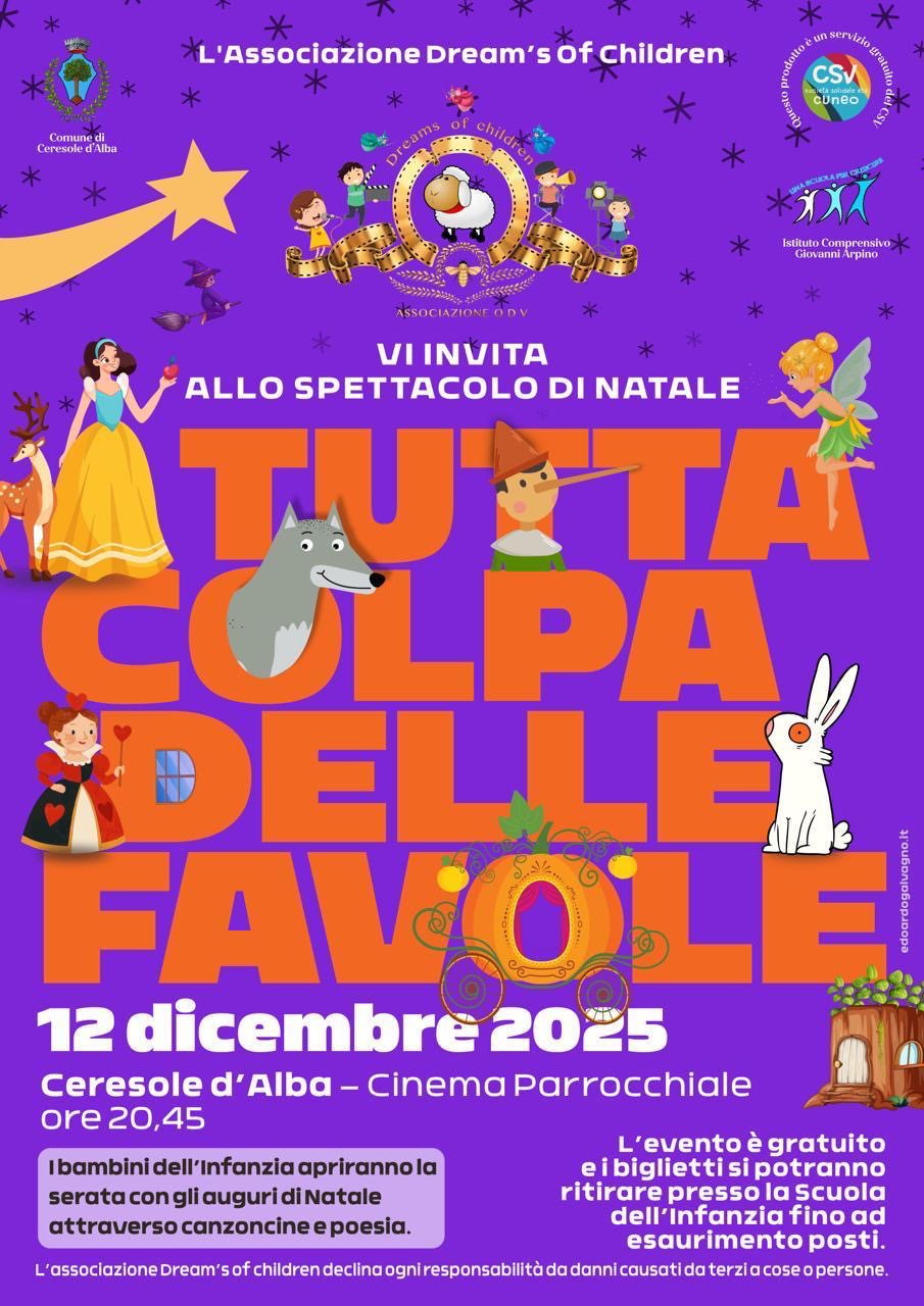 L’Associazione “Dream’s of Children” organizza lo spettacolo di Natale dal titolo “TUTTA COLPA DELLE FAVOLE” per venerdì 12 dicembre alle ore 20:45 presso il Cinema Parrocchiale.