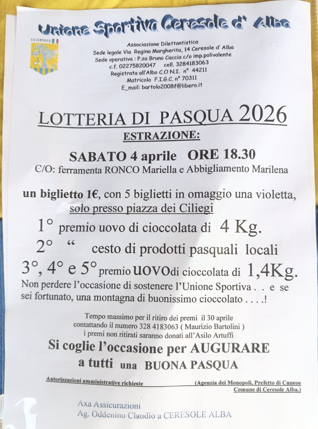 L’Unione Sportiva di Ceresole d’Alba organizza la LOTTERIA DI PASQUA 2026 con estrazione finale sabato 4 aprile alle ore 18:30.