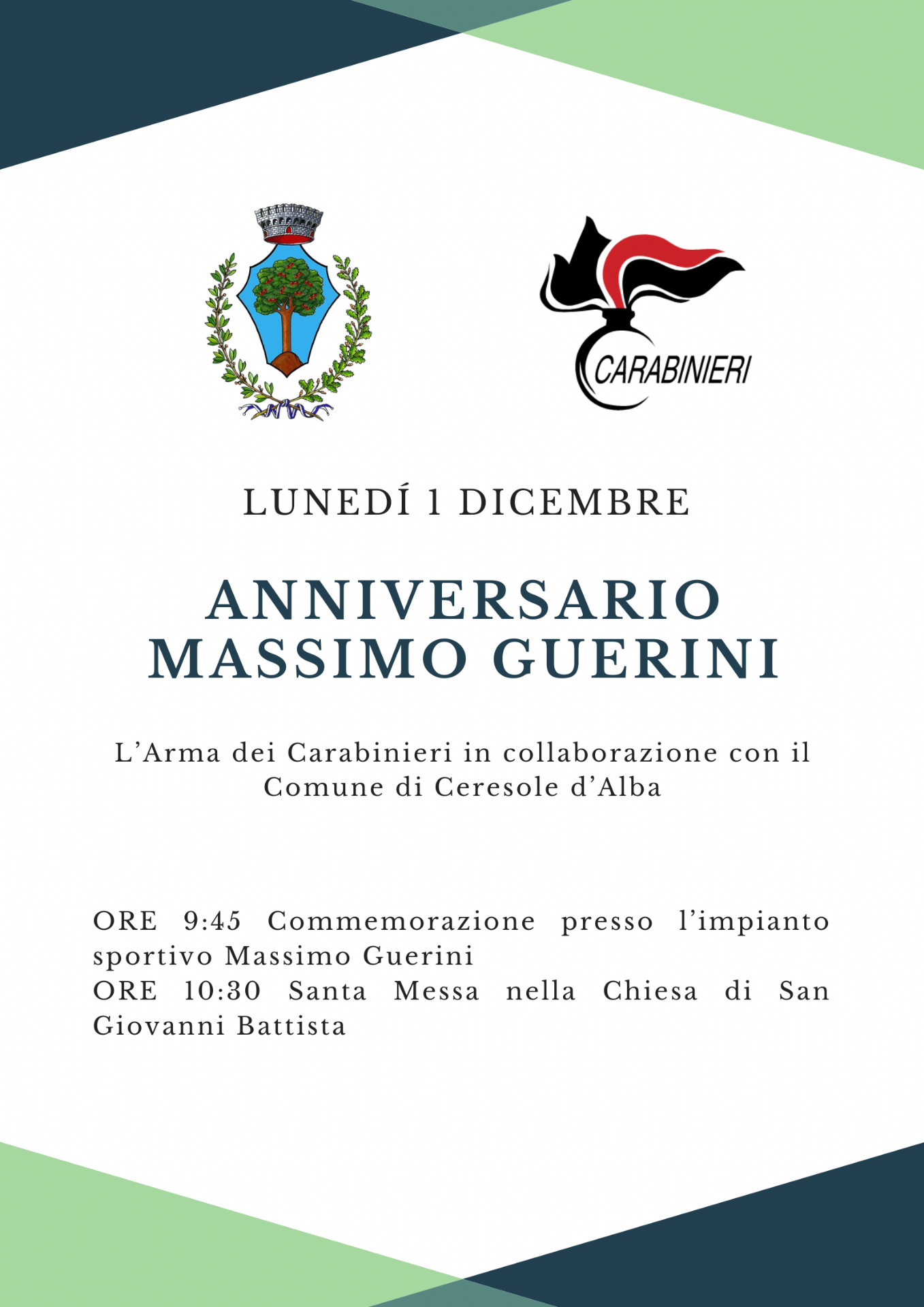 Lunedì 1 dicembre si svolgerà la commemorazione per il ventiduesimo anniversario dalla morte dell'Appuntato scelto e medaglia d'oro Massimo Guerini.