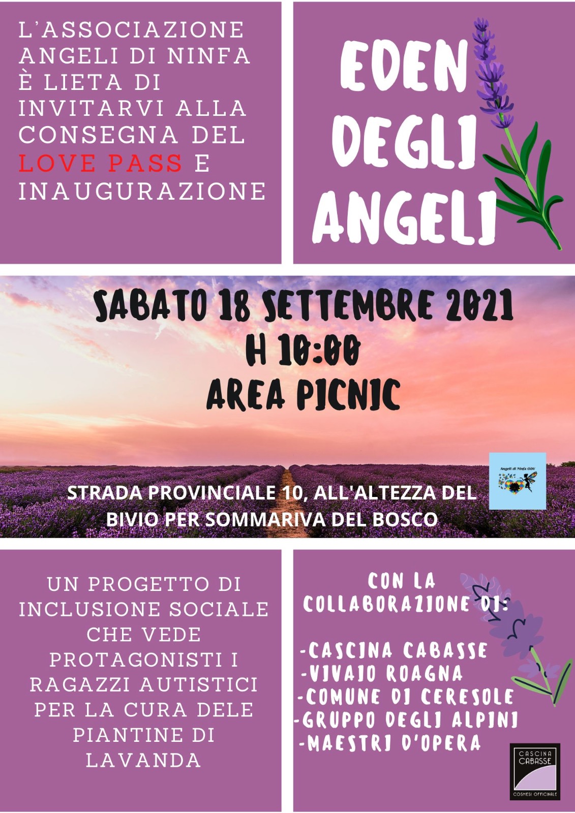 Sabato 18 Settembre alle ore 10.00 presso l'area verde all' incrocio con Sommariva del Bosco, grazie alla collaborazione nata tra l'Associazione Angeli di Linfa (che si occupa ti inclusione per le persone autistiche, il comune e il Gruppo alpini di Ceresole d'Alba e Cascina Cabasse, sarà inaugurata la nuova aiuola che ospiterà centinaia di piante di lavanda.