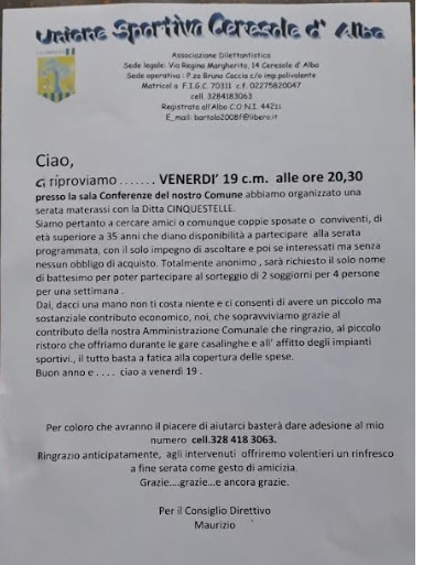 Riceviamo e volentieri divulghiamo la richiesta della nostra Unione Sportiva di Ceresole d'Alba per partecipare ad una serata "materassi" a supporto delle tante attività dell'associazione. Vi invitiamo a partecipare VENERDI 19/1 alle 20.30 presso la sala conferenze del comune!