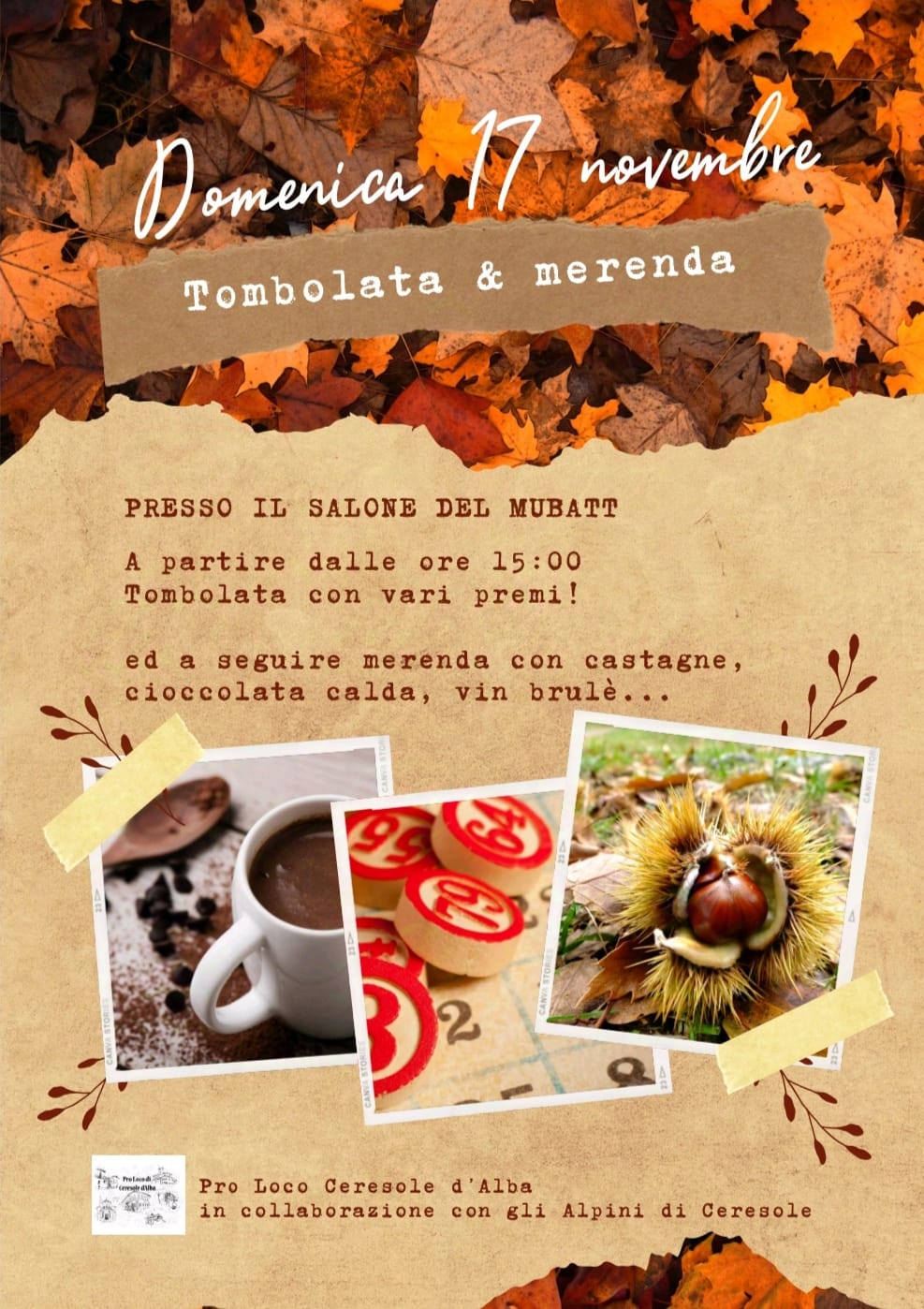 Domenica 17 novembre a partire dalle ore 15:00 la Pro Loco di Ceresole d'Alba in collaborazione con il gruppo Alpini organizza la tombolata con vari premi presso il salone del Mubatt; a seguire merenda.