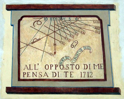 Essa presenta un quadrante solare piano verticale declinante occidentale, e all'interno il testo "all'opposto di Me / pensa di Te 1712", "Propere Conditur Dies" (latino: Presto finisce il giorno).
