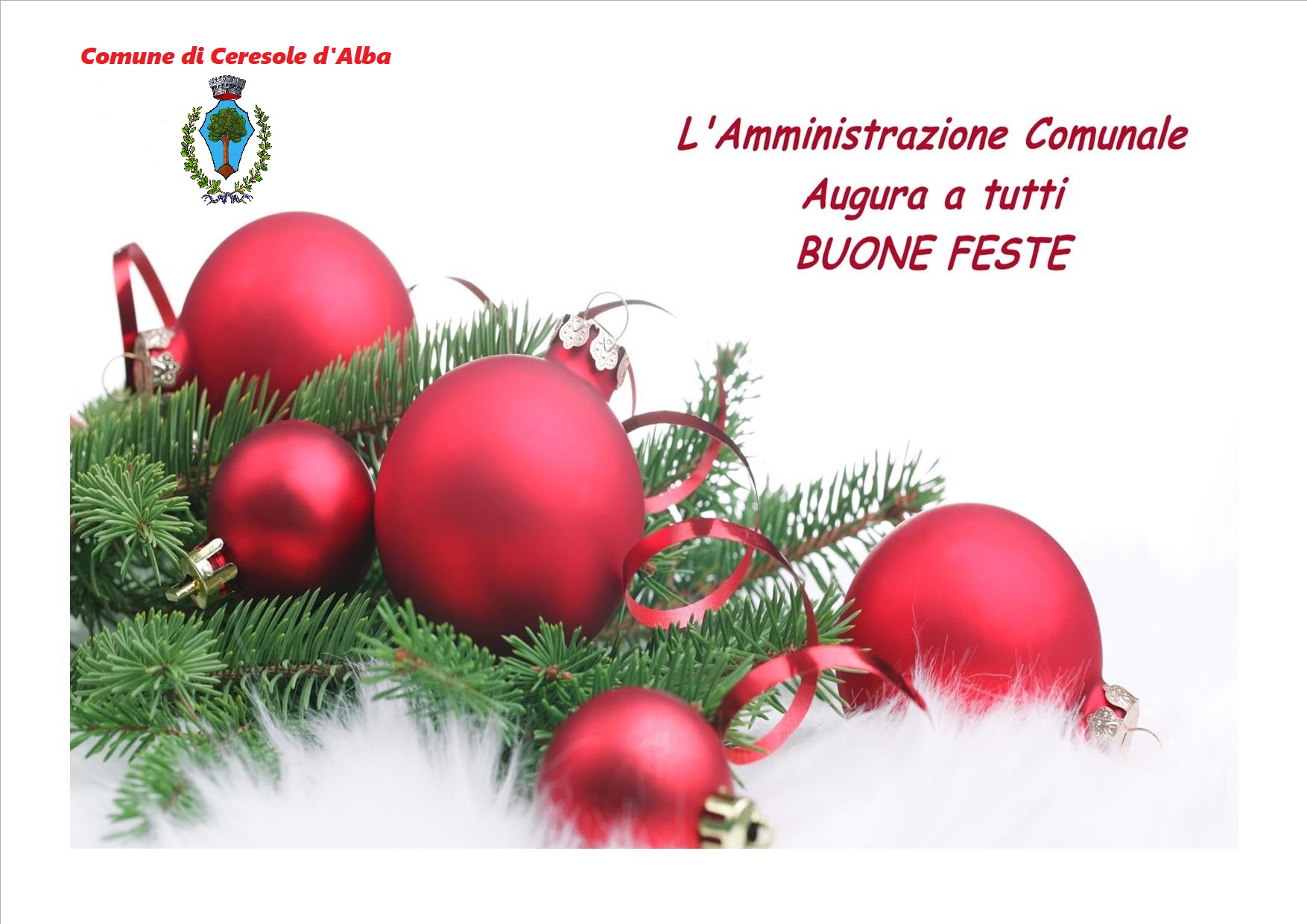 Il Sindaco, l’Amministrazione Comunale e i Dipendenti del comune di Ceresole d'Alba augurano a tutti i Ceresolesi un sereno Natale ed un felice anno nuovo.