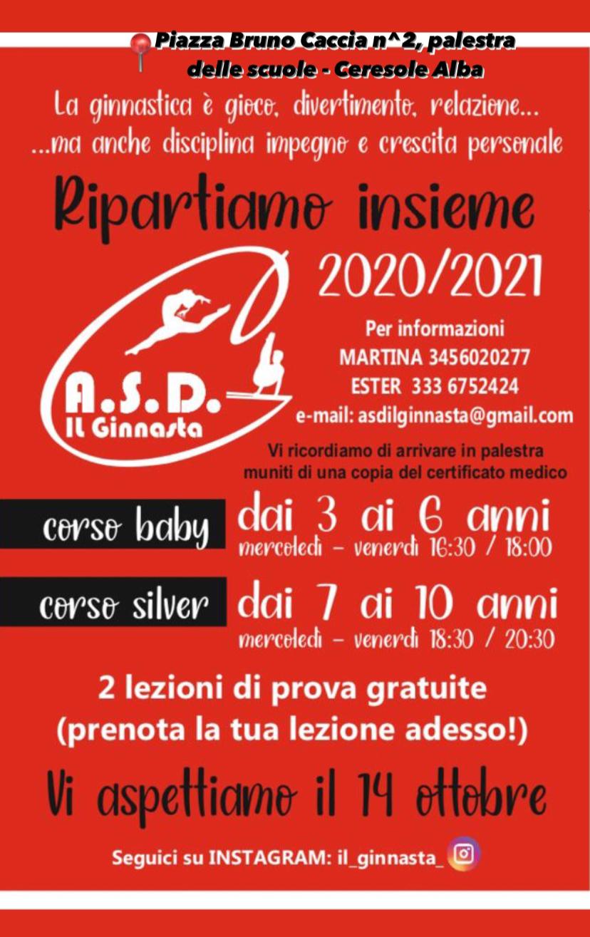 L'A.S.D. Il Ginnasta di Ceresole comunica che in ottobre ripartono i corsi di ginnastica "baby" e "silver".