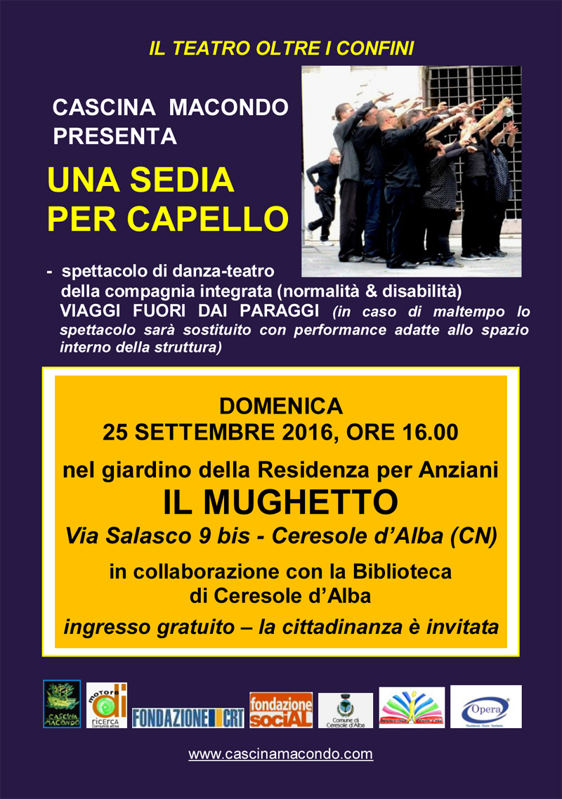 Domenica 25 settembre ore 16 verrà presentato presso la residenza per anziani “Il Mughetto” di Ceresole d’Alba lo spettacolo di danzateatro “Una sedia per capello” a cura della compagnia integrata (normalità e disabilità) “Viaggi fuori dai paraggi”.