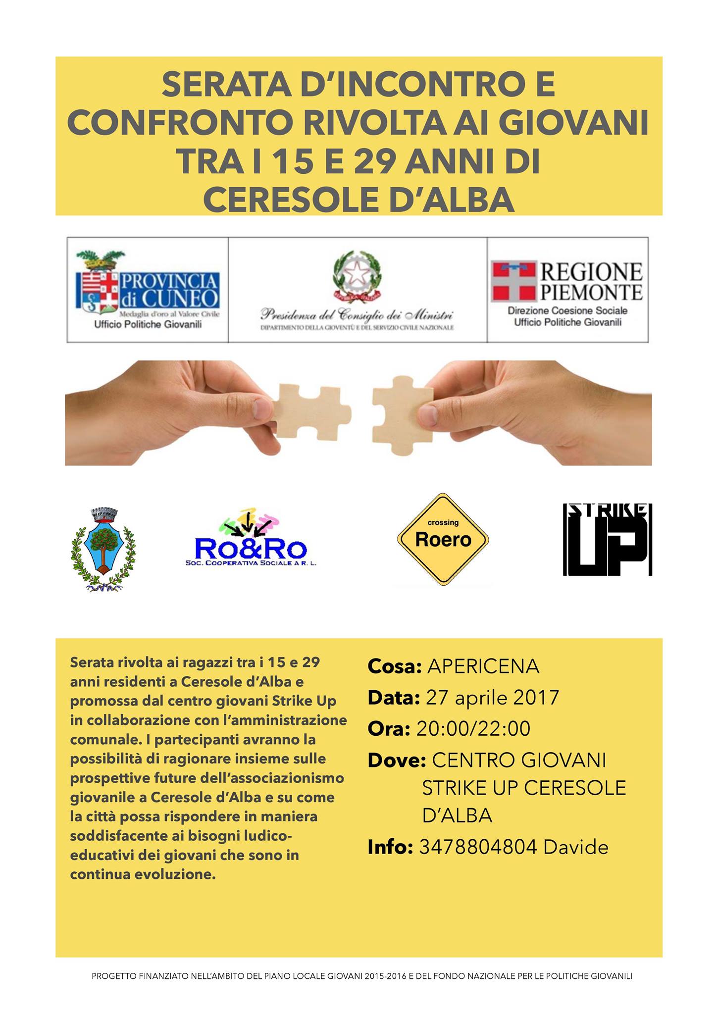 Giovedì 27 aprile alle ore 20.00, il Centro Giovani Strike-up, in collaborazione con l'Amministrazione comunale, propone una serata di incontro e confronto per i ragazzi tra i 15 e i 29 anni.