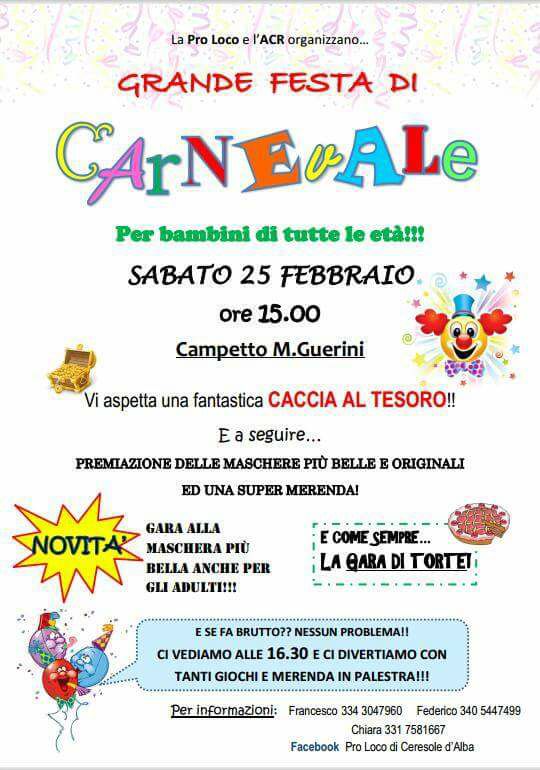 L'ACR di Ceresole d'Alba in collaborazione con la Proloco vi invitano alla festa di CARNEVALE che si terrà sabato 25 Febbraio presso il Campetto sportivo Guerini.