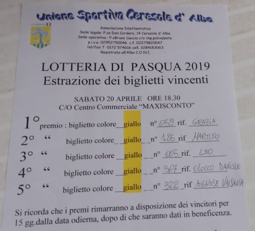 I VINCITORI DELLA LOTTERIA DI PASQUA a sostegno dell'Associazione Sportiva