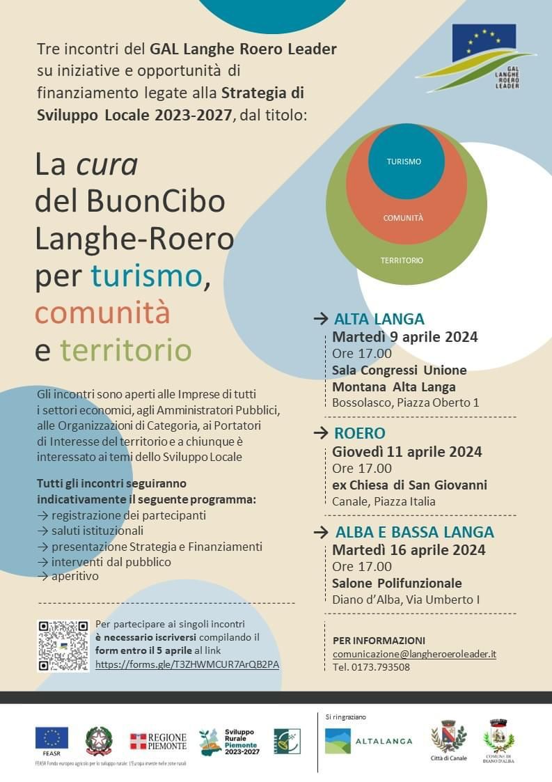Giovedì 11 Aprile alle ore 17.00 a Canale, nella ex Chiesa San Giovanni in piazza Italia, il GAL (Gruppo Azione Locale Langhe Roero Leader - Fondi Europei) presenta la strategia dello sviluppo locale 23-27 . L’ invito a partecipare è rivolto alle imprese e ad altri soggetti interessati per condividere le opportunità di finanziamento con chi vuole investire su cibo, turismo e territorio nei vari settori dello sviluppo locale (produzione, trasformazione, commercio, turismo, servizi, cooperazione, ambiente, paesaggio, …