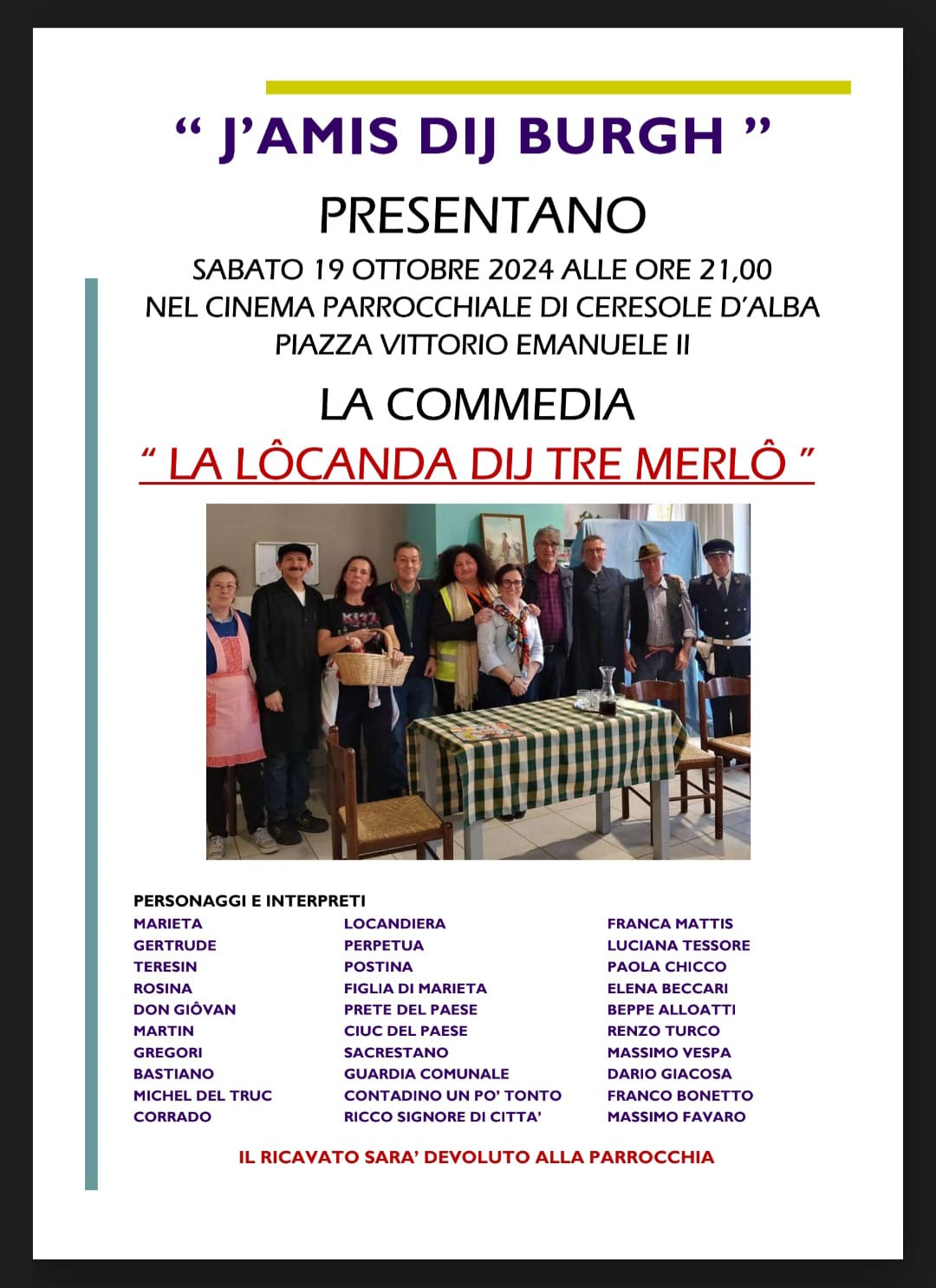 Sabato 19 ottobre 2024 alle ore 21:00 nel cinema parrocchiale di Ceresole d'Alba "J'amis dij burgh" presentano la commedia "La lôcanda dij tre merlô", il cui ricavato sarà devoluto per le spese del cinema parrocchiale.