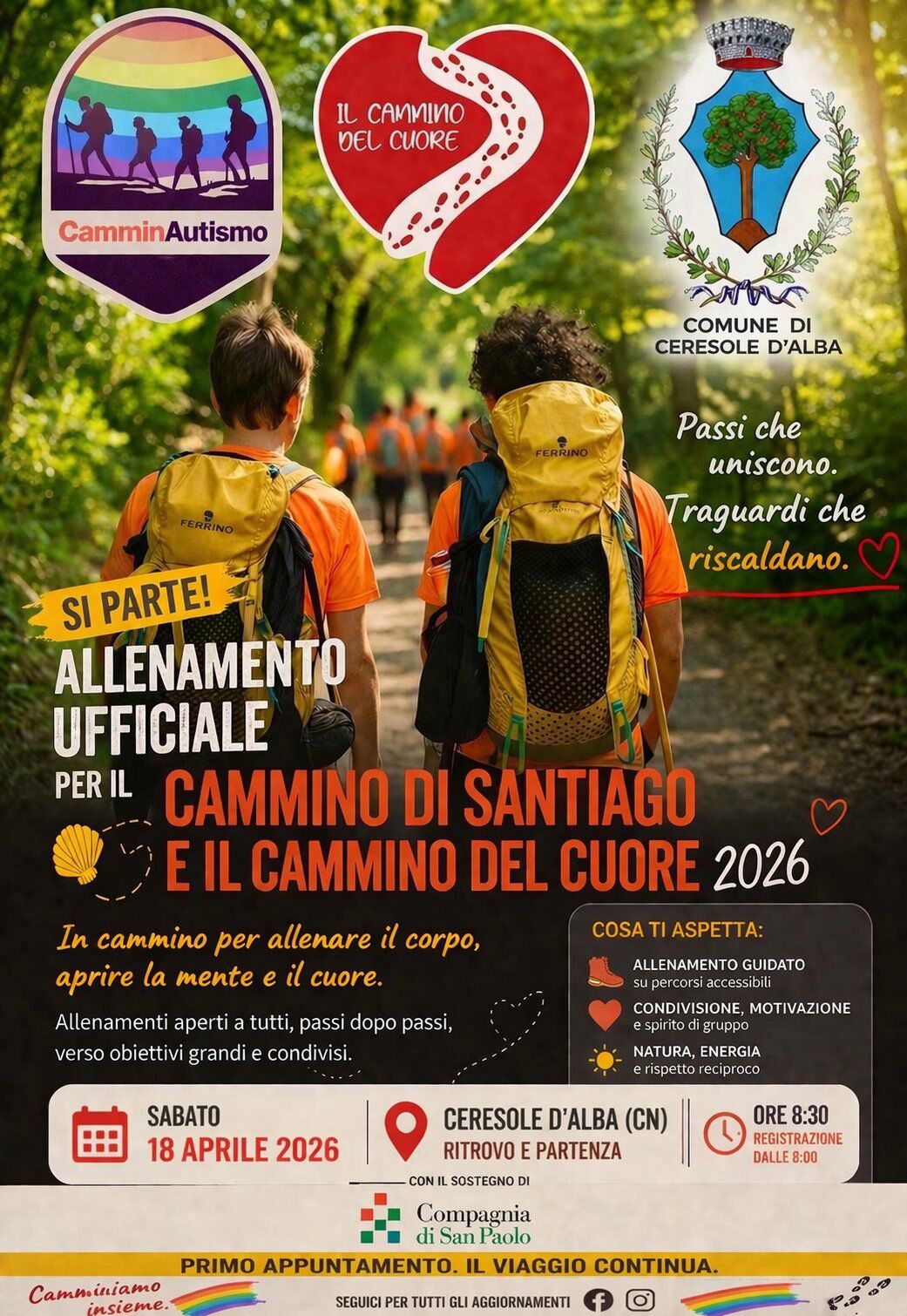 Il Comune di Ceresole d’Alba è lieto di patrocinare e ospitare, con il sostegno della Fondazione Compagnia di San Paolo, il primo allenamento ufficiale in preparazione al Cammino di Santiago e al Cammino del Cuore 2026, promosso dal progetto CamminAutismo.
