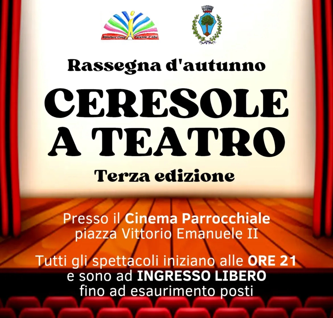 Torna la rassegna teatrale d'autunno a Ceresole d'Alba: quattro appuntamenti presso il Cinema Parrocchiale in piazza Vittorio Emanuele II; tutti gli spettacoli iniziano alle ore 21:00 e sono ad ingresso libero fino ad esaurimento posti.