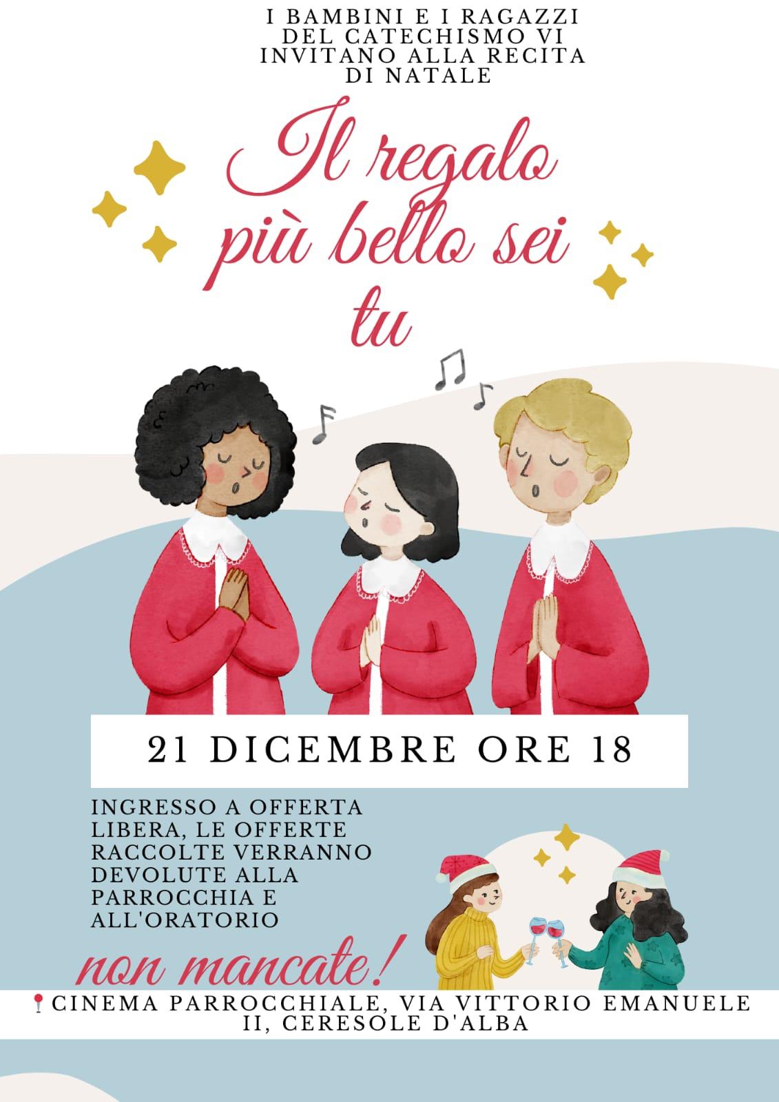 Sabato 21 dicembre 2024 alle ore 18:00 i bambini e i ragazzi del catechismo vi invitano alla recita di Natale "Il regalo più bello sei tu" presso il Cinema Parrocchiale di Ceresole d'Alba.