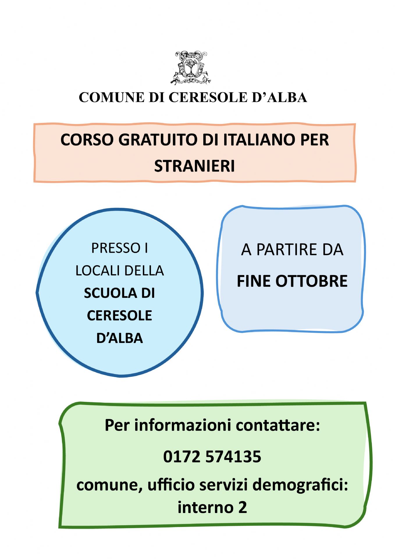 Si terrà mercoledì 13 novembre alle ore 20.00 presso la Sala Conferenze del Comune di Ceresole d'Alba (via Regina Margherita 14), l'incontro di presentazione del corso di italiano per stranieri, organizzato dal Comune di Ceresole d'Alba in collaborazione con il CPIA CN 2 e l'Associazione Anolf - Oltre le frontiere.